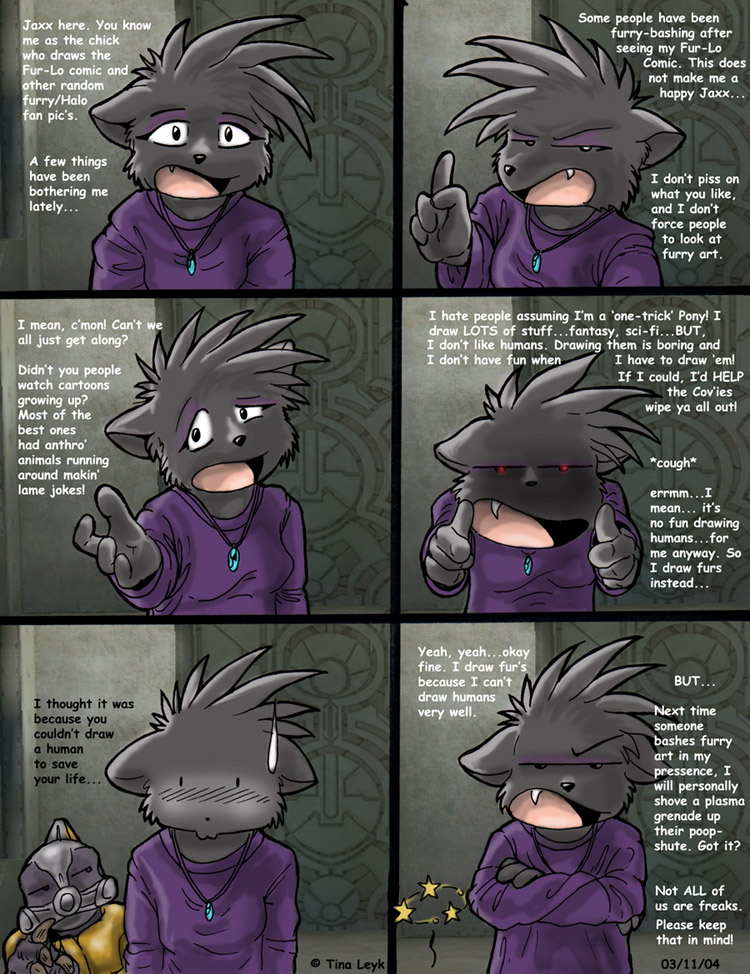 The original site for Fur-Lo is over at FurNation, a website devoted to providing space for Fur fans. Fur-Lo is here at HBO with the permission of the artist, and is not the primary site for this comic - we're simply providing mirror space so that masses of new Halo fans don't overwhelm the original site. We're grateful to Tina Leyk for allowing us to provide this service.