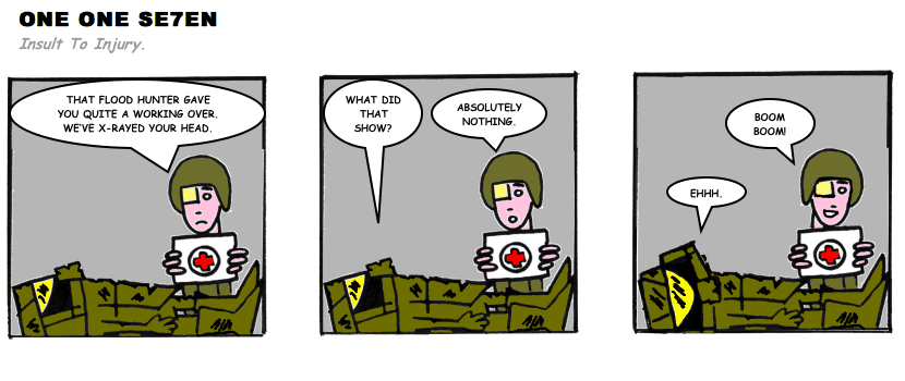 On April 30, 2003, Stuntmutt began turning in episodes of a new comic known as One One Se7en. We'll present them here, in the order in which they were submitted, as they come in. New submissions were added Monday, Wednesday, and Friday. On March 3, 2008, One One Se7en was retired from regular releases - Stunt's life got a tad too busy for 3 strips per week. (He still comes by with new content when the situation arises, however.)