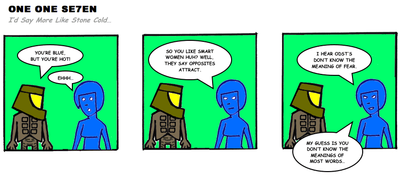 On April 30, 2003, Stuntmutt began turning in episodes of a new comic known as One One Se7en. We'll present them here, in the order in which they were submitted, as they come in. New submissions were added Monday, Wednesday, and Friday. On March 3, 2008, One One Se7en was retired from regular releases - Stunt's life got a tad too busy for 3 strips per week. (He still comes by with new content when the situation arises, however.)
