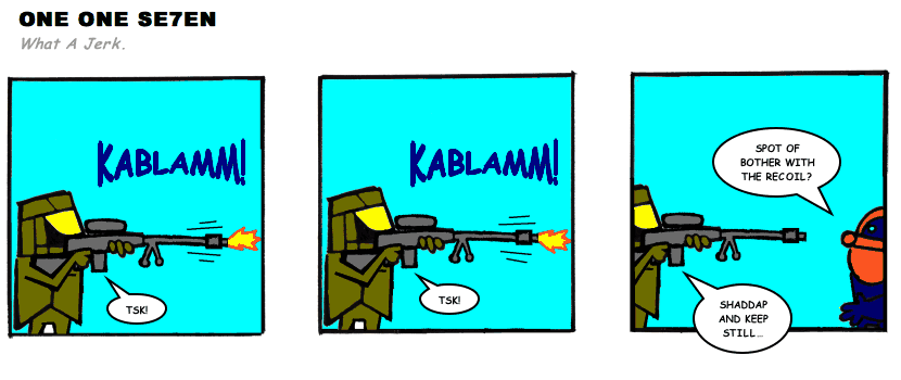 On April 30, 2003, Stuntmutt began turning in episodes of a new comic known as One One Se7en. We'll present them here, in the order in which they were submitted, as they come in. New submissions were added Monday, Wednesday, and Friday. On March 3, 2008, One One Se7en was retired from regular releases - Stunt's life got a tad too busy for 3 strips per week. (He still comes by with new content when the situation arises, however.)