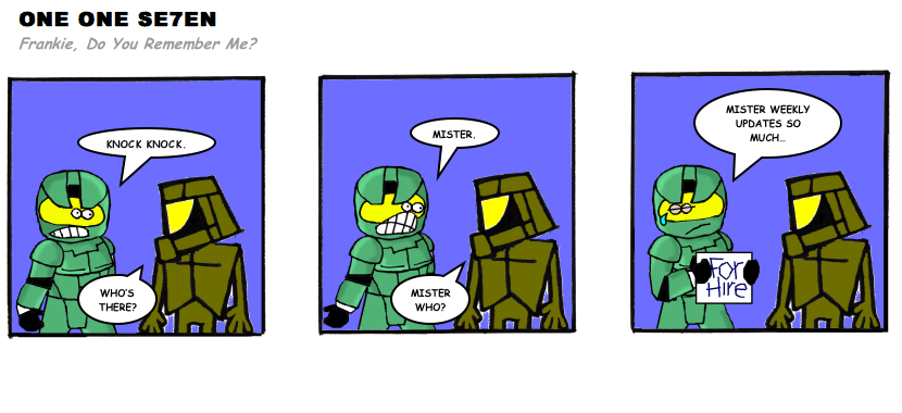 On April 30, 2003, Stuntmutt began turning in episodes of a new comic known as One One Se7en. We'll present them here, in the order in which they were submitted, as they come in. New submissions were added Monday, Wednesday, and Friday. On March 3, 2008, One One Se7en was retired from regular releases - Stunt's life got a tad too busy for 3 strips per week. (He still comes by with new content when the situation arises, however.)