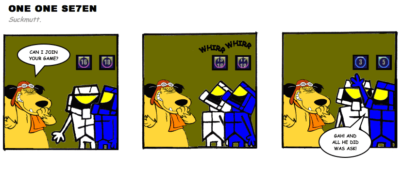 On April 30, 2003, Stuntmutt began turning in episodes of a new comic known as One One Se7en. We'll present them here, in the order in which they were submitted, as they come in. New submissions were added Monday, Wednesday, and Friday. On March 3, 2008, One One Se7en was retired from regular releases - Stunt's life got a tad too busy for 3 strips per week. (He still comes by with new content when the situation arises, however.)