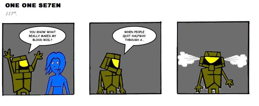 On April 30, 2003, Stuntmutt began turning in episodes of a new comic known as One One Se7en. We'll present them here, in the order in which they were submitted, as they come in. New submissions were added Monday, Wednesday, and Friday. On March 3, 2008, One One Se7en was retired from regular releases - Stunt's life got a tad too busy for 3 strips per week. (He still comes by with new content when the situation arises, however.)