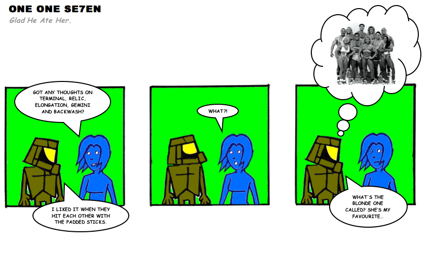 On April 30, 2003, Stuntmutt began turning in episodes of a new comic known as One One Se7en. We'll present them here, in the order in which they were submitted, as they come in. New submissions were added Monday, Wednesday, and Friday. On March 3, 2008, One One Se7en was retired from regular releases - Stunt's life got a tad too busy for 3 strips per week. (He still comes by with new content when the situation arises, however.)