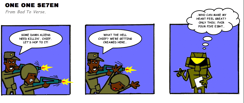 On April 30, 2003, Stuntmutt began turning in episodes of a new comic known as One One Se7en. We'll present them here, in the order in which they were submitted, as they come in. New submissions were added Monday, Wednesday, and Friday. On March 3, 2008, One One Se7en was retired from regular releases - Stunt's life got a tad too busy for 3 strips per week. (He still comes by with new content when the situation arises, however.)