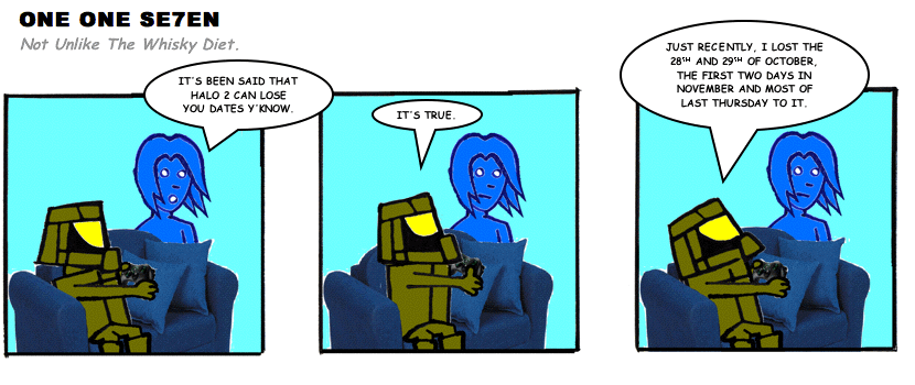 On April 30, 2003, Stuntmutt began turning in episodes of a new comic known as One One Se7en. We'll present them here, in the order in which they were submitted, as they come in. New submissions were added Monday, Wednesday, and Friday. On March 3, 2008, One One Se7en was retired from regular releases - Stunt's life got a tad too busy for 3 strips per week. (He still comes by with new content when the situation arises, however.)