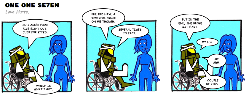 On April 30, 2003, Stuntmutt began turning in episodes of a new comic known as One One Se7en. We'll present them here, in the order in which they were submitted, as they come in. New submissions were added Monday, Wednesday, and Friday. On March 3, 2008, One One Se7en was retired from regular releases - Stunt's life got a tad too busy for 3 strips per week. (He still comes by with new content when the situation arises, however.)
