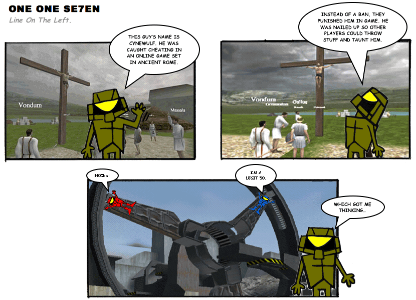 On April 30, 2003, Stuntmutt began turning in episodes of a new comic known as One One Se7en. We'll present them here, in the order in which they were submitted, as they come in. New submissions were added Monday, Wednesday, and Friday. On March 3, 2008, One One Se7en was retired from regular releases - Stunt's life got a tad too busy for 3 strips per week. (He still comes by with new content when the situation arises, however.)