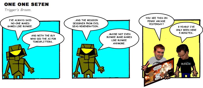 On April 30, 2003, Stuntmutt began turning in episodes of a new comic known as One One Se7en. We'll present them here, in the order in which they were submitted, as they come in. New submissions were added Monday, Wednesday, and Friday. On March 3, 2008, One One Se7en was retired from regular releases - Stunt's life got a tad too busy for 3 strips per week. (He still comes by with new content when the situation arises, however.)