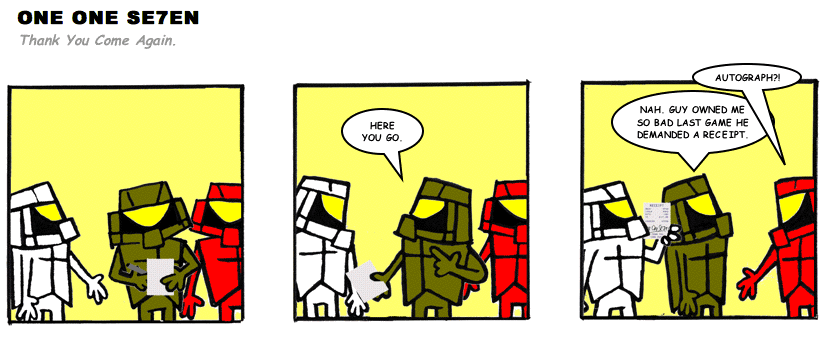 On April 30, 2003, Stuntmutt began turning in episodes of a new comic known as One One Se7en. We'll present them here, in the order in which they were submitted, as they come in. New submissions were added Monday, Wednesday, and Friday. On March 3, 2008, One One Se7en was retired from regular releases - Stunt's life got a tad too busy for 3 strips per week. (He still comes by with new content when the situation arises, however.)