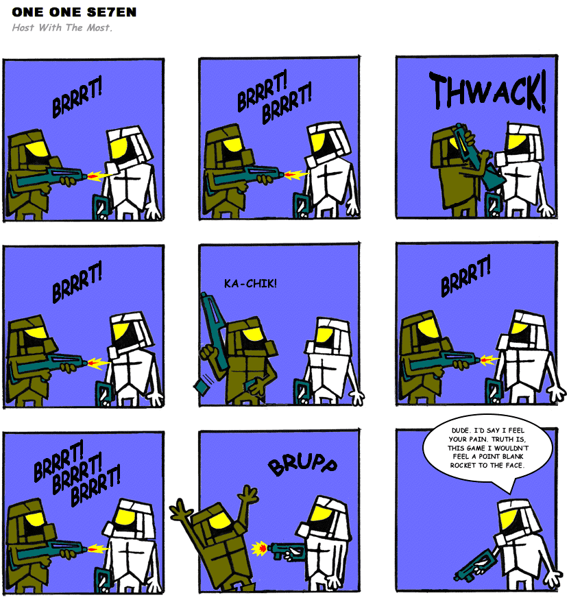 On April 30, 2003, Stuntmutt began turning in episodes of a new comic known as One One Se7en. We'll present them here, in the order in which they were submitted, as they come in. New submissions were added Monday, Wednesday, and Friday. On March 3, 2008, One One Se7en was retired from regular releases - Stunt's life got a tad too busy for 3 strips per week. (He still comes by with new content when the situation arises, however.)