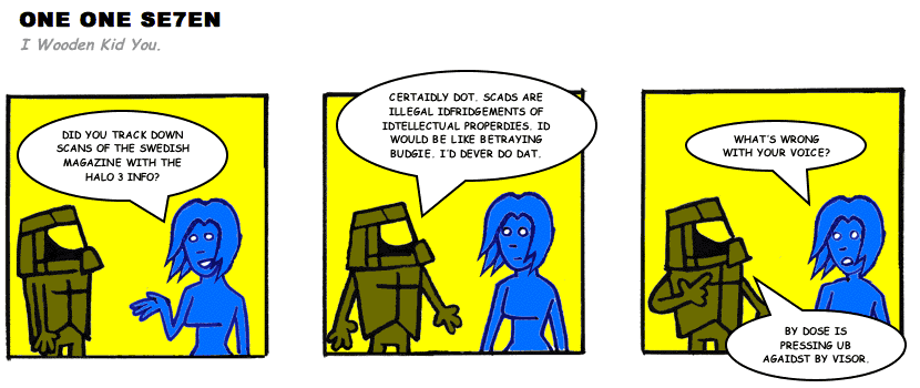 On April 30, 2003, Stuntmutt began turning in episodes of a new comic known as One One Se7en. We'll present them here, in the order in which they were submitted, as they come in. New submissions were added Monday, Wednesday, and Friday. On March 3, 2008, One One Se7en was retired from regular releases - Stunt's life got a tad too busy for 3 strips per week. (He still comes by with new content when the situation arises, however.)