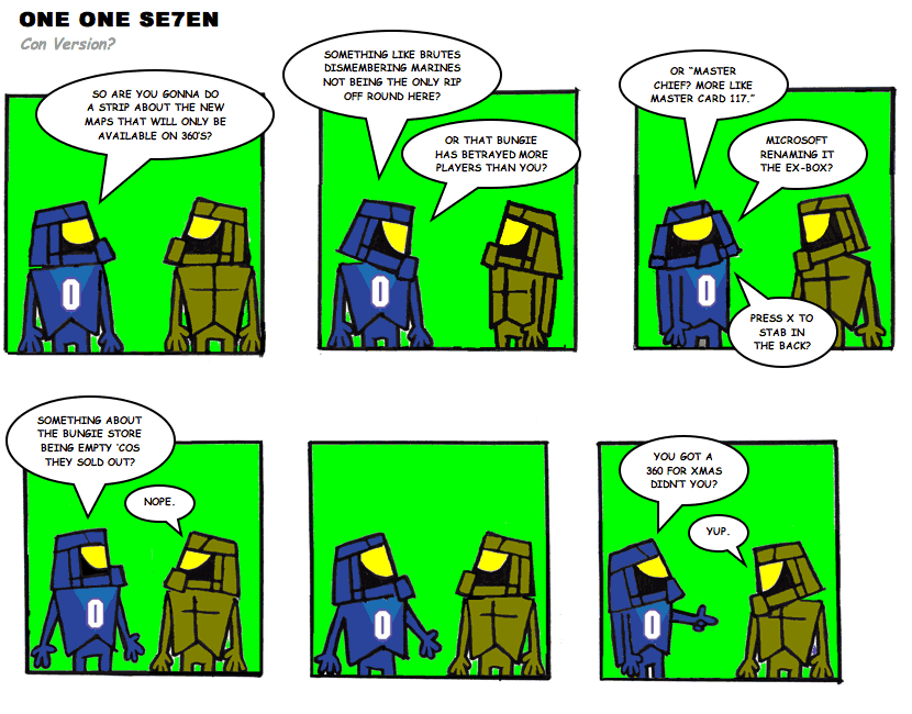 On April 30, 2003, Stuntmutt began turning in episodes of a new comic known as One One Se7en. We'll present them here, in the order in which they were submitted, as they come in. New submissions were added Monday, Wednesday, and Friday. On March 3, 2008, One One Se7en was retired from regular releases - Stunt's life got a tad too busy for 3 strips per week. (He still comes by with new content when the situation arises, however.)