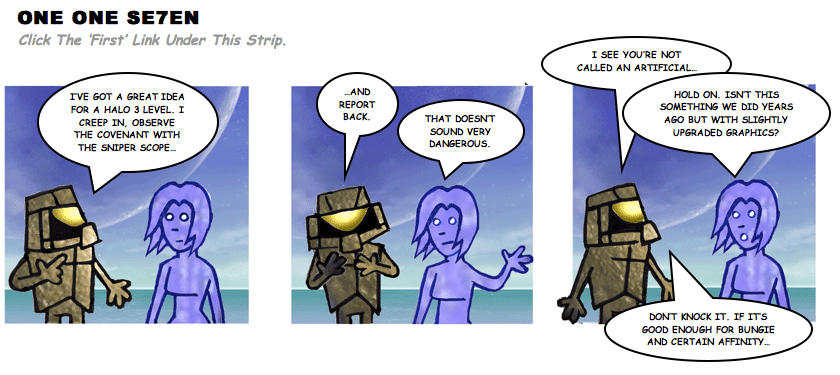 On April 30, 2003, Stuntmutt began turning in episodes of a new comic known as One One Se7en. We'll present them here, in the order in which they were submitted, as they come in. New submissions were added Monday, Wednesday, and Friday. On March 3, 2008, One One Se7en was retired from regular releases - Stunt's life got a tad too busy for 3 strips per week. (He still comes by with new content when the situation arises, however.)