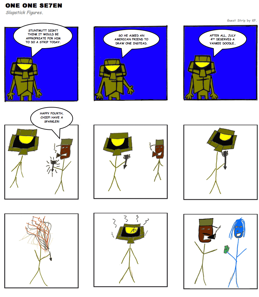 On April 30, 2003, Stuntmutt began turning in episodes of a new comic known as One One Se7en. We'll present them here, in the order in which they were submitted, as they come in. New submissions were added Monday, Wednesday, and Friday. On March 3, 2008, One One Se7en was retired from regular releases - Stunt's life got a tad too busy for 3 strips per week. (He still comes by with new content when the situation arises, however.)