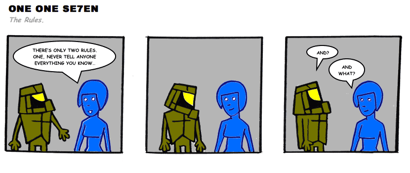 On April 30, 2003, Stuntmutt began turning in episodes of a new comic known as One One Se7en. We'll present them here, in the order in which they were submitted, as they come in. New submissions were added Monday, Wednesday, and Friday. On March 3, 2008, One One Se7en was retired from regular releases - Stunt's life got a tad too busy for 3 strips per week. (He still comes by with new content when the situation arises, however.)
