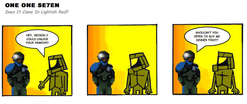On April 30, 2003, Stuntmutt began turning in episodes of a new comic known as One One Se7en. We'll present them here, in the order in which they were submitted, as they come in. New submissions were added Monday, Wednesday, and Friday. On March 3, 2008, One One Se7en was retired from regular releases - Stunt's life got a tad too busy for 3 strips per week. (He still comes by with new content when the situation arises, however.)