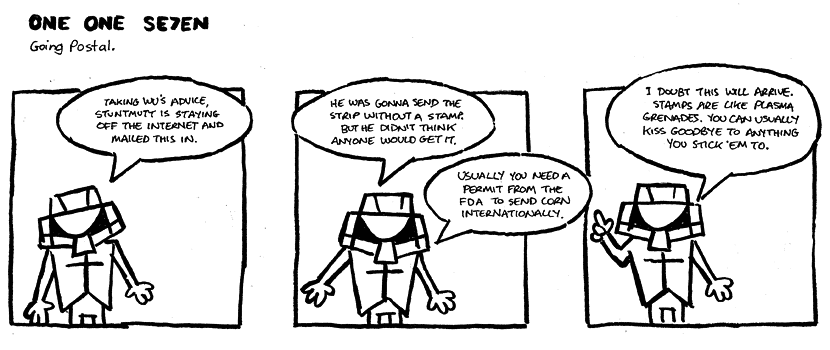 On April 30, 2003, Stuntmutt began turning in episodes of a new comic known as One One Se7en. We'll present them here, in the order in which they were submitted, as they come in. New submissions were added Monday, Wednesday, and Friday. On March 3, 2008, One One Se7en was retired from regular releases - Stunt's life got a tad too busy for 3 strips per week. (He still comes by with new content when the situation arises, however.)