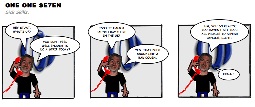 On April 30, 2003, Stuntmutt began turning in episodes of a new comic known as One One Se7en. We'll present them here, in the order in which they were submitted, as they come in. New submissions were added Monday, Wednesday, and Friday. On March 3, 2008, One One Se7en was retired from regular releases - Stunt's life got a tad too busy for 3 strips per week. (He still comes by with new content when the situation arises, however.)