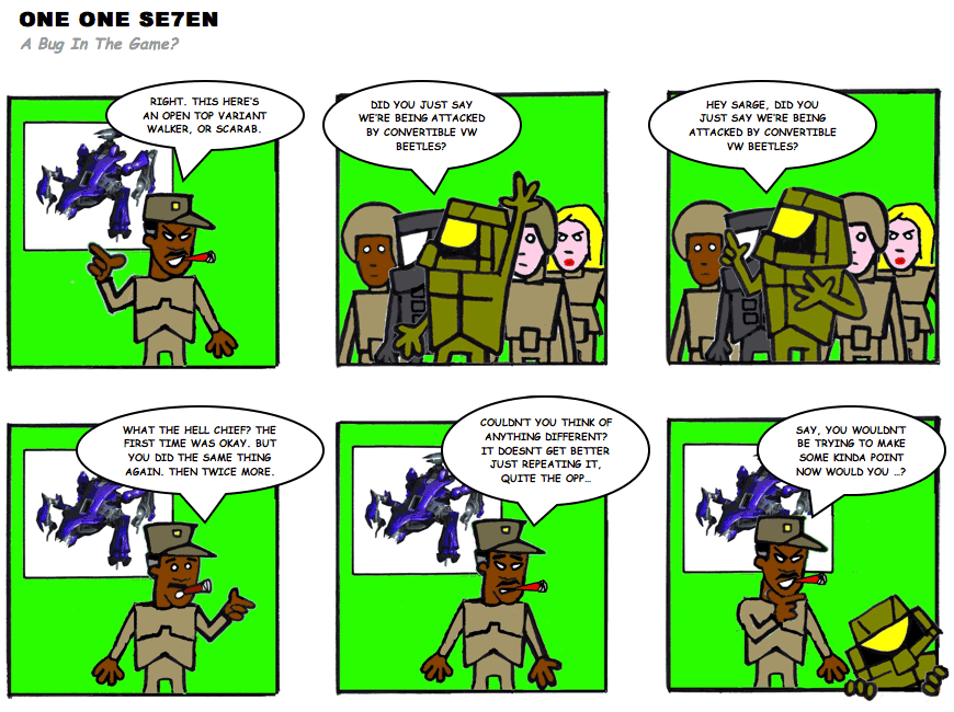 On April 30, 2003, Stuntmutt began turning in episodes of a new comic known as One One Se7en. We'll present them here, in the order in which they were submitted, as they come in. New submissions were added Monday, Wednesday, and Friday. On March 3, 2008, One One Se7en was retired from regular releases - Stunt's life got a tad too busy for 3 strips per week. (He still comes by with new content when the situation arises, however.)