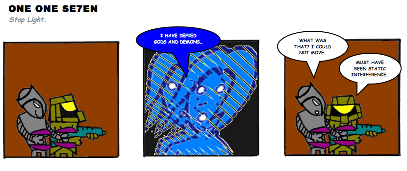 On April 30, 2003, Stuntmutt began turning in episodes of a new comic known as One One Se7en. We'll present them here, in the order in which they were submitted, as they come in. New submissions were added Monday, Wednesday, and Friday. On March 3, 2008, One One Se7en was retired from regular releases - Stunt's life got a tad too busy for 3 strips per week. (He still comes by with new content when the situation arises, however.)