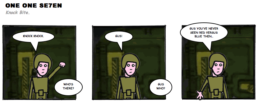 On April 30, 2003, Stuntmutt began turning in episodes of a new comic known as One One Se7en. We'll present them here, in the order in which they were submitted, as they come in. New submissions were added Monday, Wednesday, and Friday. On March 3, 2008, One One Se7en was retired from regular releases - Stunt's life got a tad too busy for 3 strips per week. (He still comes by with new content when the situation arises, however.)