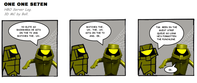 On April 30, 2003, Stuntmutt began turning in episodes of a new comic known as One One Se7en. We'll present them here, in the order in which they were submitted, as they come in. New submissions were added Monday, Wednesday, and Friday. On March 3, 2008, One One Se7en was retired from regular releases - Stunt's life got a tad too busy for 3 strips per week. (He still comes by with new content when the situation arises, however.)