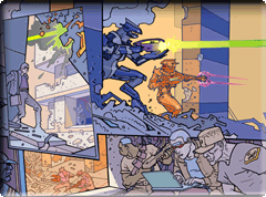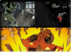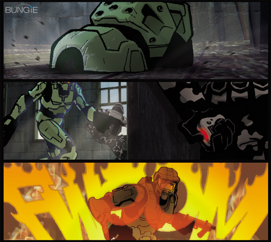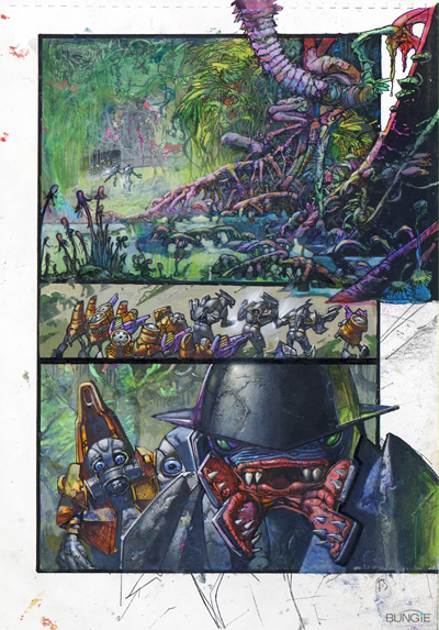 The project actually started about a year and a half ago. Bungie artist Lorraine McLees' passion for the graphic novel medium, and her contacts from the industry led to us getting a budget together, sourcing the writers and artists and creating the initial premises for the stories. Once we'd done that, we set off an inexorable chain reaction of talent, and the treatments, samples and eventually, the finished panels started rolling in. Oddly enough, we got more than three quarters of the way through the project before we secured the coolest publisher in the business. Marvel. ('Nuff said.) This isn't the normal mode of production, but the folks at Marvel shared our excitement for both the Halo universe, and the brilliant team of creative types we'd already assembled. A deal was signed and we're basically handing off the completed book as a faits accomplis, but using Marvel's guidance and expertise to take it from the (literal) drawing board to the bookstore shelves. This would also be a fine moment to give special thanks to Alicia in our IP department for getting the deal done with the home of Stan Lee. In the end, my theory that Namor: The Sub-Mariner could take Aquaman in a fight had nothing to do with anything. You'd be amazed how many of my awesome ideas get ignored. Only a few pages remain to be completed at this time, and there are lots of little odds and ends that take time - final lettering, color corrections, occasional visual edits, but sitting in front of us right now is a 95% complete version of the book. And it's a doozie. Titles of the stories may change, but pretty much everything is in place. Just about every staff member has a favorite artist who shows up in this HGN. My own personal hero in here, is Simon Bisley, whose Slaine artwork from 2000ad comic pretty much inspired my whole life. It's the main reason I wear a loincloth and a hero-harness, so to have this legendary artist working on our stories, our universe, was a rare honor. And as I mentioned before, each artist in the collection inspired that kind of fanboyism, from Moebius to Darrow, from Hale to Fischer. Each artist, somebody's childhood (or contemporary) hero. And uh, not to toot my own horn, but there's a Mister Chief hidden in this book somewhere too. Some say, the greatest Mister Chief ever conceived. Others say, every bit as crap as every other Mister Chief. Oh, and I also tricked some of our community members into "sending" letters to the HGN before it was even announced. Robt McLees, who did much of the planning, editing and structuring of the stories, pointed out that Nihei is possibly his favorite, a) Because he signed Robt's Nihei artbook AND bought some stuff he was auctioning for charity for $1000! Lorraine, recovering on maternity leave, probably wants to point out that I'm her favorite artist because my brushstrokes so eloquently capture the morass of modern existence and delicately phrase the anguished wails of a gentle soul, trapped in the maelstrom of trite consumerism. Probably that's what she's thinking. Unless she's thinking about legendary comic book pioneer Moebius. I guess that's possible... So here, without further ado, is a sneak peek at what to expect from the Halo Graphic Novel. Halo Graphic Novel Cover The cover is by mega-crayon-meister Phil Hale. This is a preliminary treatment and the final cover may vary. Phil Hale's elegant, dramatic pose of the Master Chief shows him leaping backwards through the air, while taking out an unseen opponent. An understated mixture of tension and movement.
