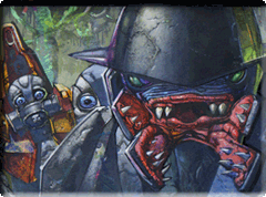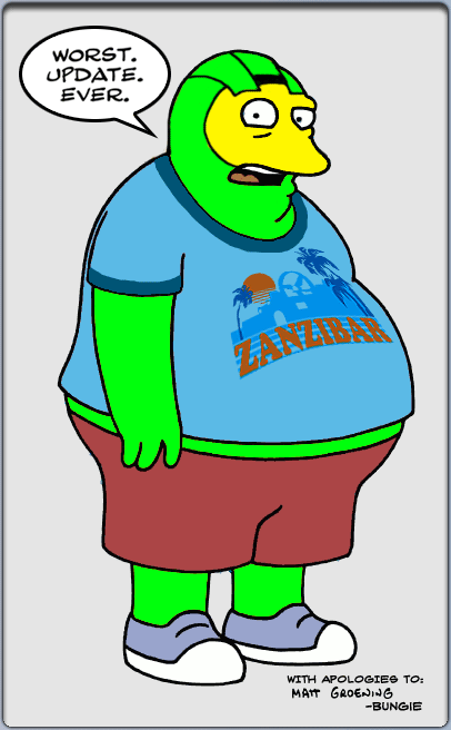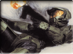 Second Sunrise Over New Mombasa Fighting a war isn't just shipping men and machines to distant worlds. There are subtler, more dangerous fights taking place on the streets of New Mombasa, and in the hearts and minds of men. - Legendary artist Moebius takes an intriguing look at the bright lights and big city of a pre-invasion New Mombasa and does so with typical Moebius flair and imagination. So that's all we can tell you about the HGN right now. Make sure you click on the sample shots to see them in better detail, and we're sure we'll reveal a couple more pages before the HGN ships. You will all be pleased to know that our new AI engineer Max, who we interviewed last week, was accosted by the Visual Studio team and shown how to make his development environment even better. Some ingenious developer has managed to integrate vim with Visual Studio, giving Max the best of both worlds! Basically, it's all a series of bleeps and whistles to me, but Max is psyched. You will also be pleased to hear that we will (finally) have a release date for the Halo 2 Soundtrack, Vol. 2, next week. That's when we announce the release date. And I'm told it's not too far away. And remember, like anything bad in the world, famine, poverty, Katherine Harris' smile etc., it's all Marty's fault. And finally a guest Mister Chief from our very own agdTinMan, who was inspired by today's comic book theme.