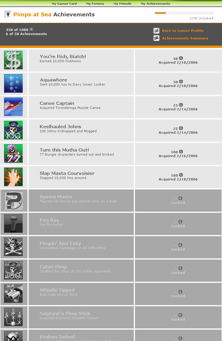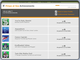 These can of course be customized, with velvet sails, gold rigging and even spinning rims. This isn't just for fun - the more pimped-out your ride, the more ladies and posse will want to associate with your organization. Invest enough time in the game and you can end up with quite an army. The graphics as you can see from the screenshot, are heavily stylized, rather than photorealistic - we looked at classics like Jet Set Radio, Zelda: Wind Waker and Ogre Battle for inspiration. We call the technique, Ho-toscoping. Seeing the world in Isometric 3D really makes it come alive, as do our detailed textures and shaders. The World of Pimps at Sea practically pops off the screen. Look carefully and you'll even spot a guest character or two from one of our other games. Now before we sign off for today and leave you to enjoy and digest this amazing announcement, there's one more treat. Since it's a 360 title, that means Achievements. For those unfamiliar with "Achievements" on Xbox Live, they're basically points and medals awarded for achieving certain goals. These goals can include anything from playing the game once, to finishing it on the hardest difficulty level possible, without losing a single life. As you can imagine, picking what goals in the game are worthy of Xbox Live achievements is more than just arbitrarily applying points - it's a matter of picking challenges that you know players will want to see. So without further ado, here's a snapshot of our in-game Xbox Live achievements from our next project. Enjoy. |
