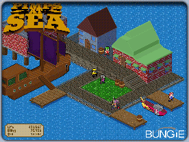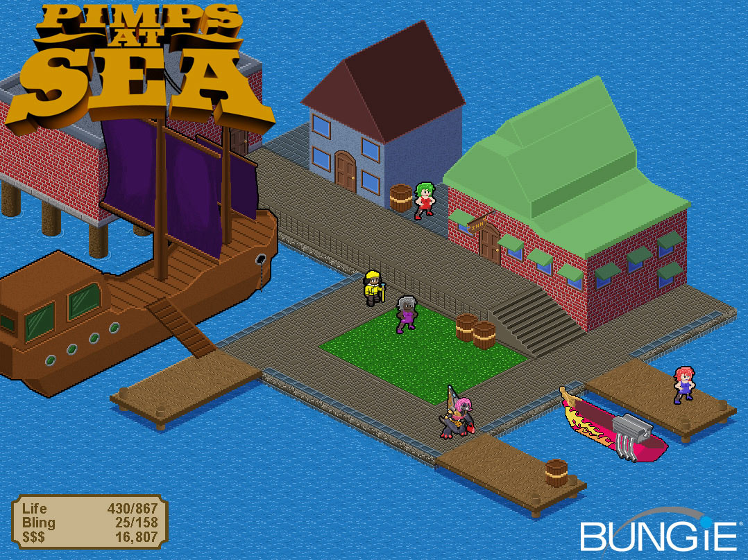 The Halo 2 soundtrack is on iTunes! That's Vol. 1, not Vol. 2, which doesn't come out until April 25th in CD form. But it does mean you can go get yerself some iTunes action right now if you didn't already pick up the soundtrack on an olde fashioned optical compact disc. I would give you a link, but you sort of can't do that with iTunes, which is weird, but whatevs. You guys can figure out how to get to it. Marty, because he's a sweetheart, has agreed to let you all hear a little sample of what to expect in the H2 Vol. 2 soundtrack and this is one piece that nobody has ever heard before. 10 seconds of hot Marty action. Click HERE to listen to a teeny snatch of never-heard music. OK, now for the big thing you were all waiting for, news about our next project. Well, we've told you a few things about this project in the past. That we've been working on it for years, that it is action packed and more recently, that it's for Xbox 360. Well, some of you have guessed what it is and while we can't officially announce it, we can show off a couple of images from it. Pimps at Sea: Avast Me Bitches... Pimps at Sea has been a long time coming. Bungie fans will be well aware that the game's magnificent scope and ambitious scale have led to countless delays. The good news is that none of the constant iterations and additions have gone to waste. We're utterly convinced that when this game ships (excuse the pun) it will revolutionize the very notion of what an RPG can be. This will undoubtedly be compared to Oblivion - and there are some parallels - a deep combat system, resource and weapon management, a robust in-game economy and of course, vast worlds. The screenshot you see here represents just a quarter of the entire game world. And even zoomed out to street-scale, you can see that it is densely populated with AI driven pimps and hos. The AI is probably our most ambitious creation. The code that drives their behavior and interaction with the game world is called, "Cognitive Pimponance," and aside from simple pathfinding, it enables the in game denizens to behave independently - turning tricks, retrieving trick-funds, even buying rims and upgrading ships independently of your control. Our Servicing-Based Economy works like this: You start the game as a low grade Pimp-Privateer. You can choose your race, physical appearance and build, customize your character in a number of ways. You start of broke without even a single Ho to your name and only a scrawny Cabin Boy named Timmy Timmins in your stable. Job one is to either earn enough money using Timmy to get a real Ho, or ramp up your powers of persuasion, charisma and "gab," to convince ladies to take employment with your organization.
