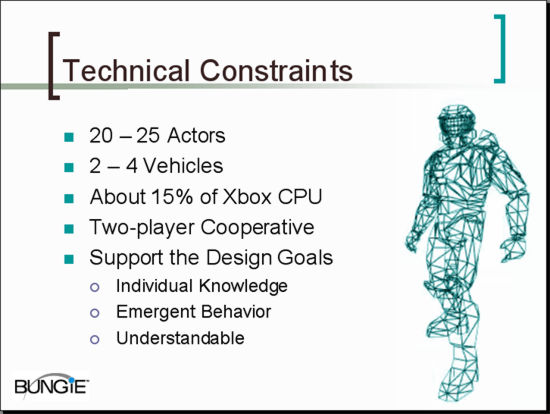 - this constraint mostly comes from the cost of character physics and animation and the fact that actors will be shooting off weapons all the time. so this is the maximum number we can have in a single battle. we make an exception for the flood infection forms, up to 100 of those.