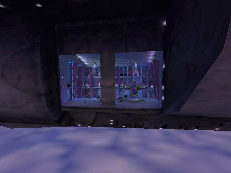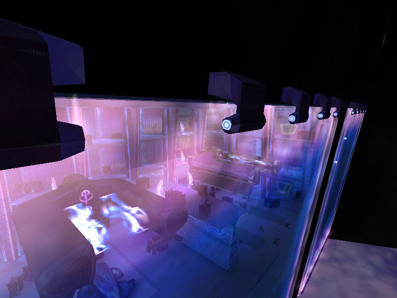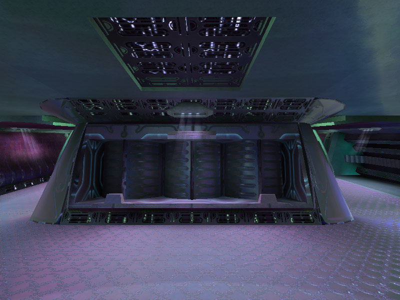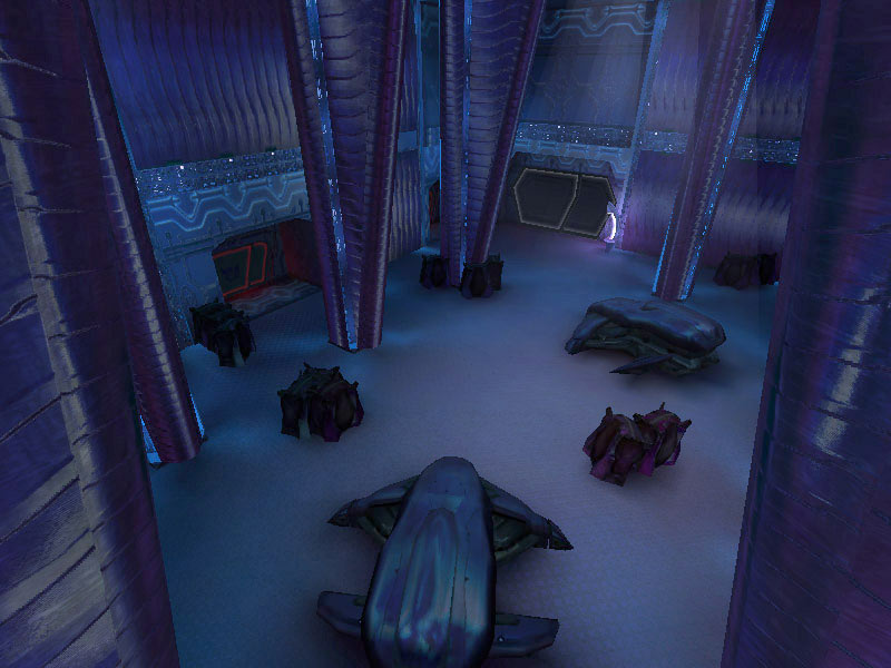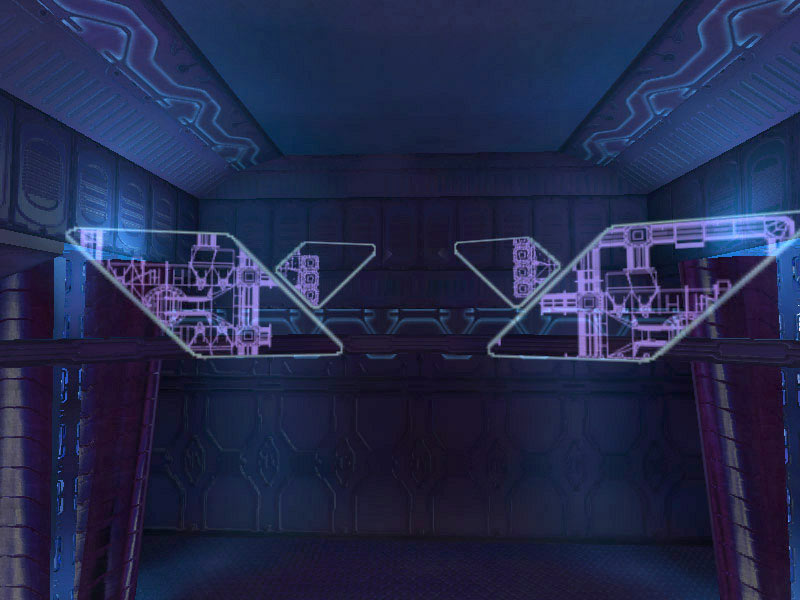 The bays are controlled by the familiar holographic controls encountered elsewhere on board the cruiser. Controls for the forcefield doors are located on a second-level platform located between the bays. The forcefields over the entrance to the bays are projected from the top of the bays down over the door's opening by a series of energy projectors.