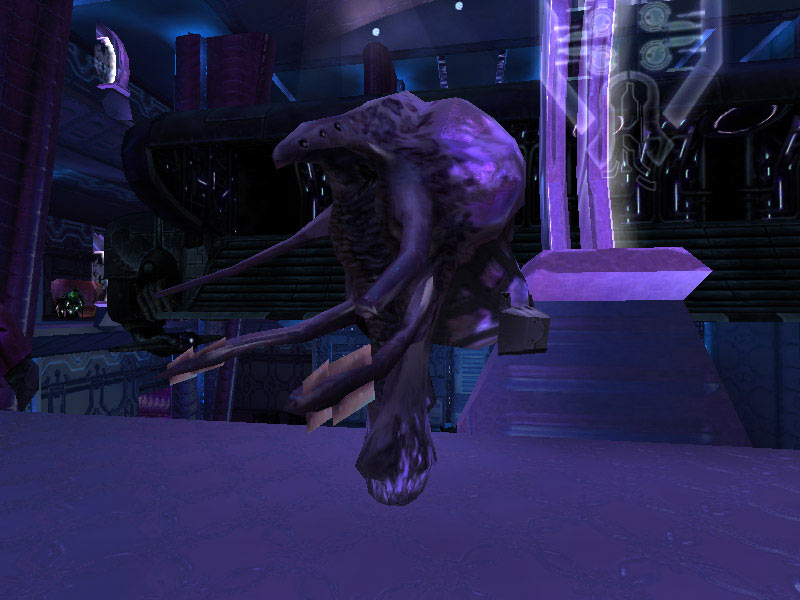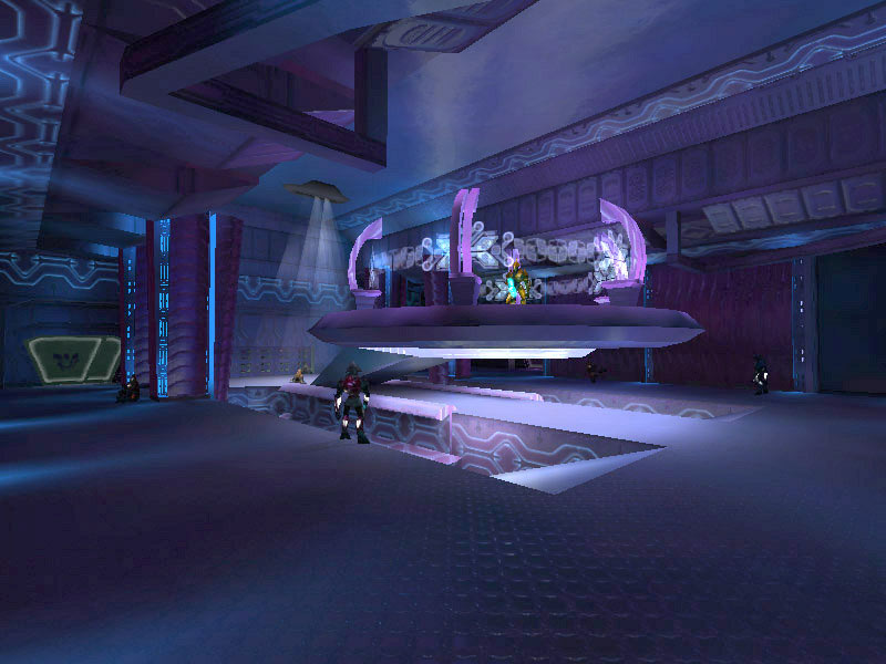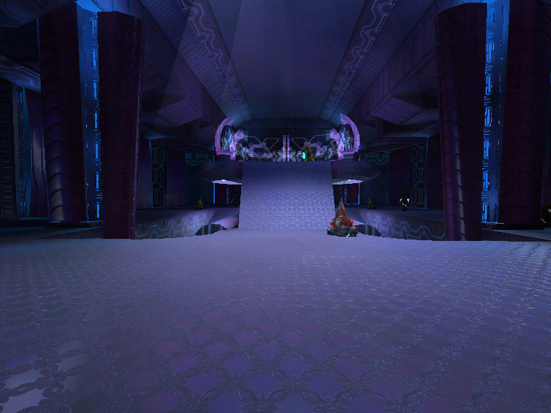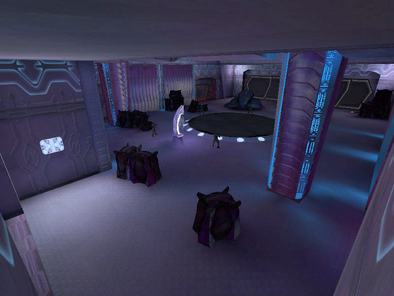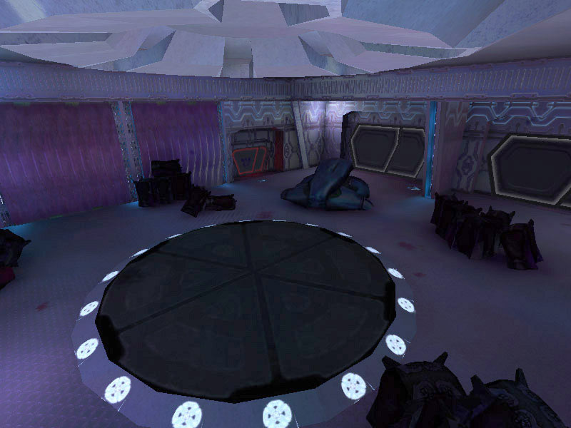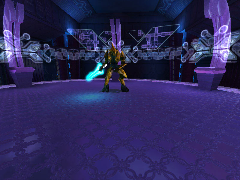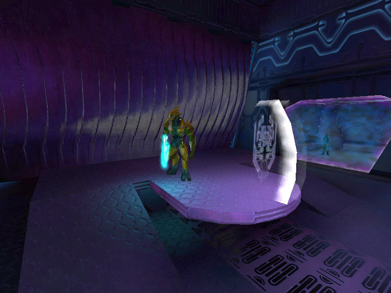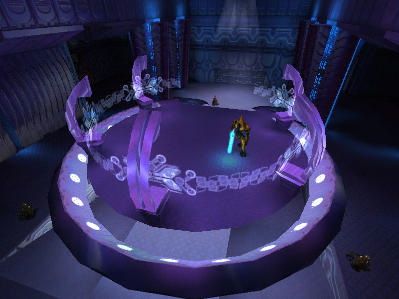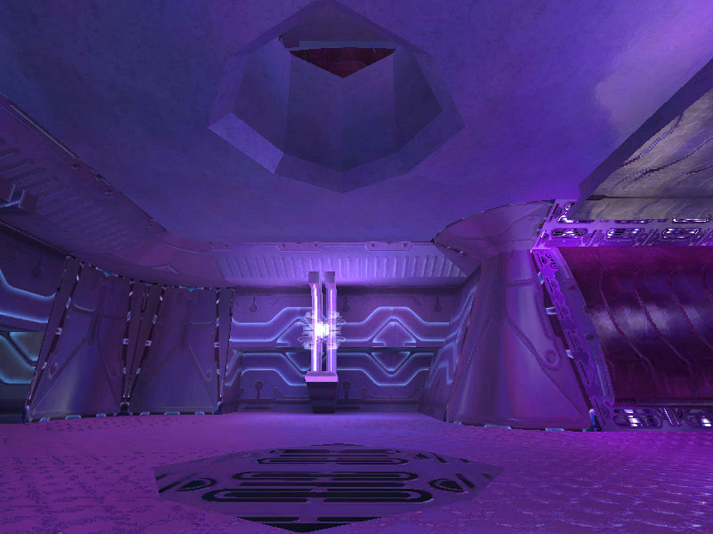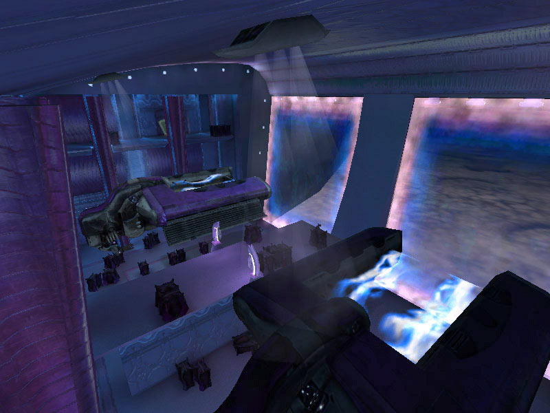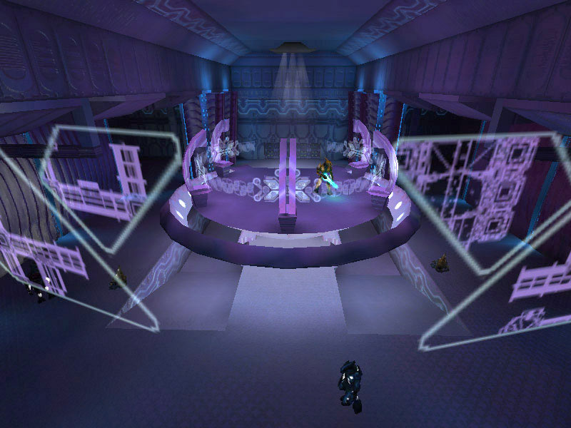 The ship's control center is characterized by a raised circular platform overlooking the rest of the room. Holographic controls line the outer perimeter of the raised dais. All Covenant shipboard holograms seem to favor the purple-blue end of the EM spectrum. It is assumed this is the favored frequency of visible light of the eyes of Elites; the primary operators of these vessels. The viewscreens are also holographic projections, visible at the forward end of the room near the ceiling. The viewscreens can either display exterior views of the ship's surroundings or can display tactical data. They can also be tied in to the security cameras on board and display ship schematics.