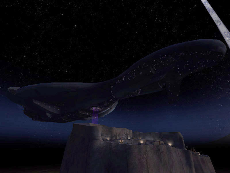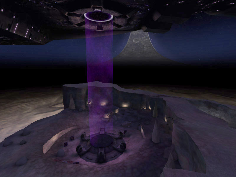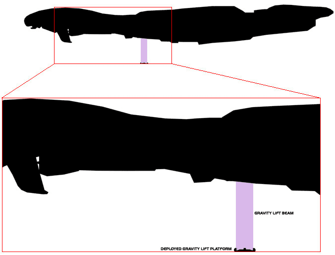 Once an object on the surface enters the gravity beam's influence, it ascends toward the ship. When it reaches the materializer, the object is converted to energy and is rematerialized on board the ship in one of the gravity lift bays. When surface operations are complete, the gravity beam pulls the lift platform into the air and once docked with the gravity lift again, the six clamps latch the platform in place.