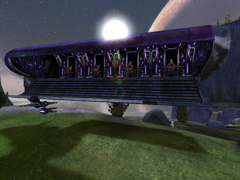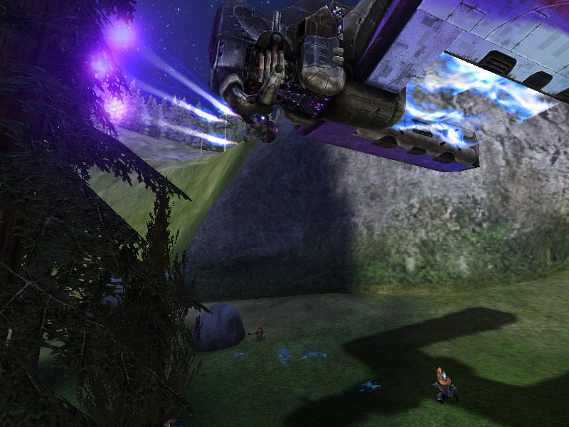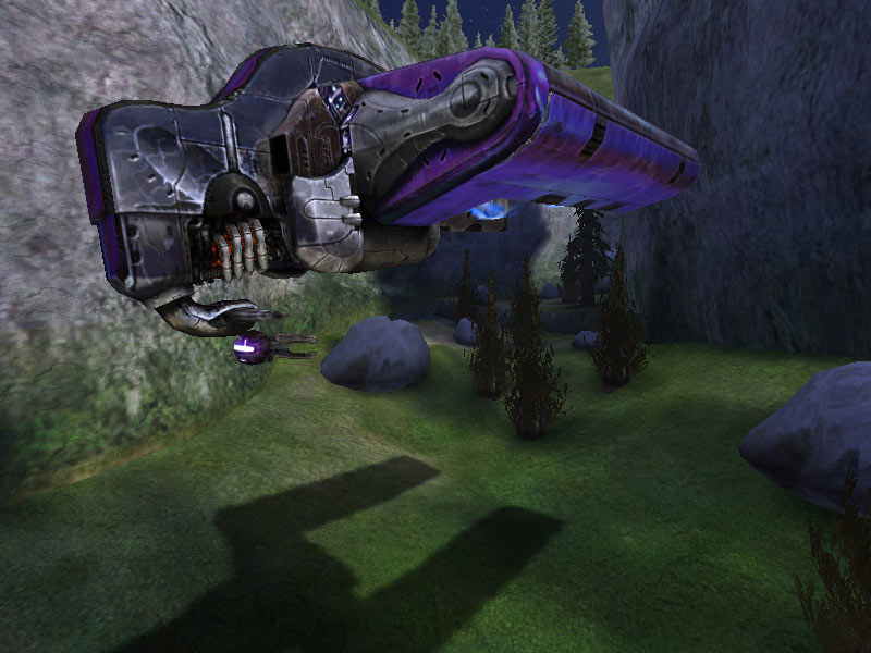 The troops carried onboard are housed within the outer halves of the twin booms. Up to 15 Covenant can be held within each hull. This shot shows the Dropship in a banking turn, about to disgorge its payload of Grunts.