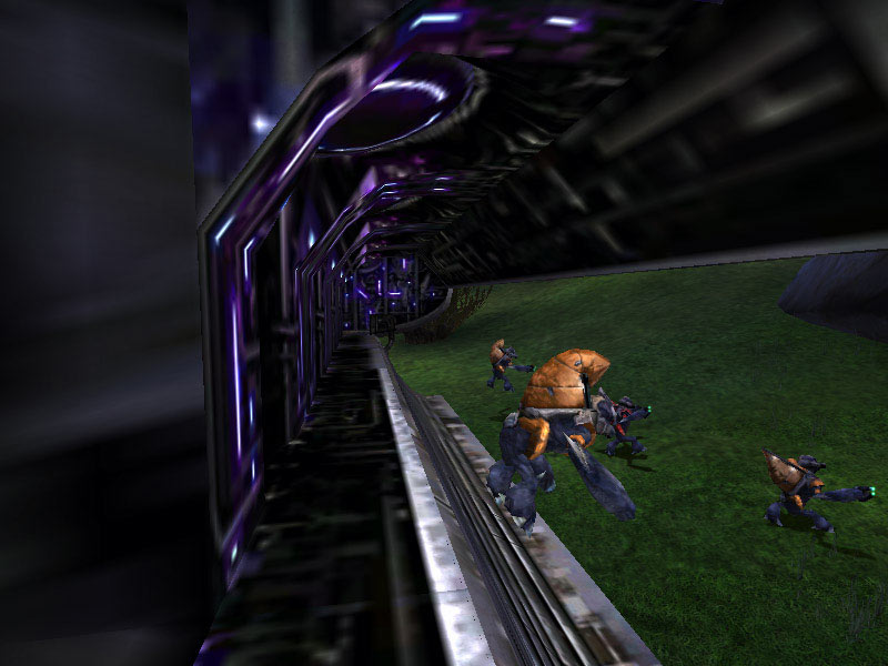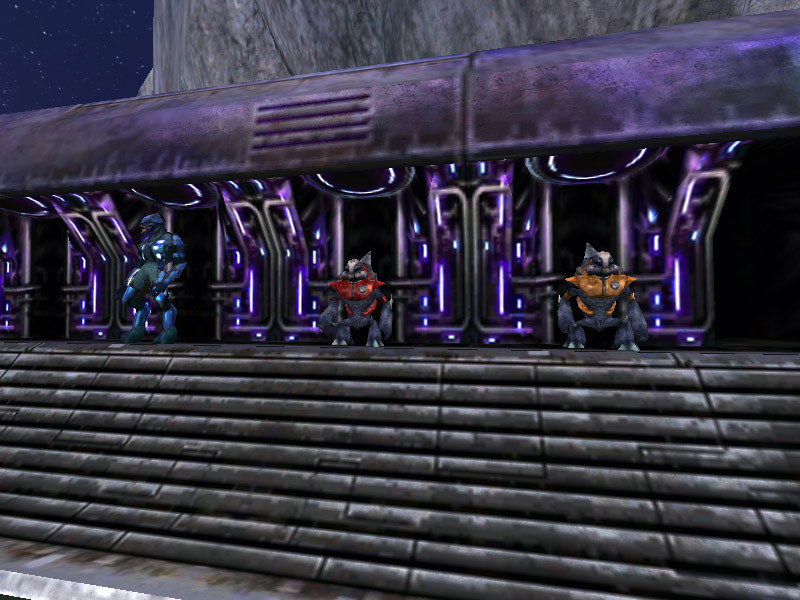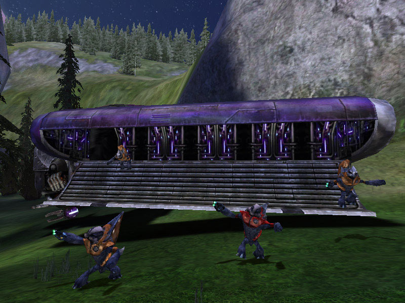 The ramp area lowers to allow the Covenant onboard to join the battle. You can see to the left of the Red Grunt the dark corridor that leads to the other side of the Dropship, as well as the control cabin.