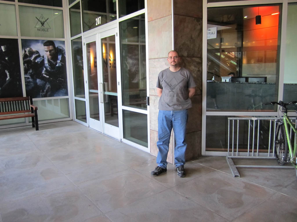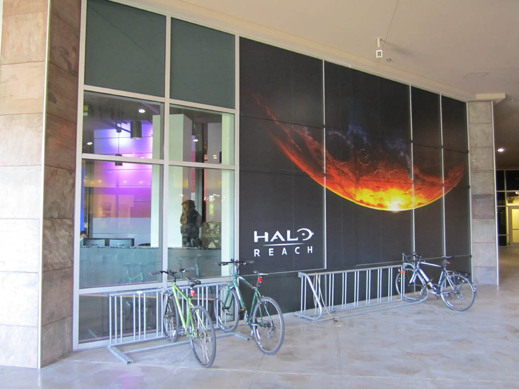 We arrived and made our way to the second level to Bungie's main entrance. We saw a (probably nervous) security guard at the desk inside as well as a box of the Legendary Edition Reach and the helmet and body armor of an ODST from the live-action commercial promoting the ODST game. The outside of the studio sported a large Reach mural and a few window decals of Noble Team members.