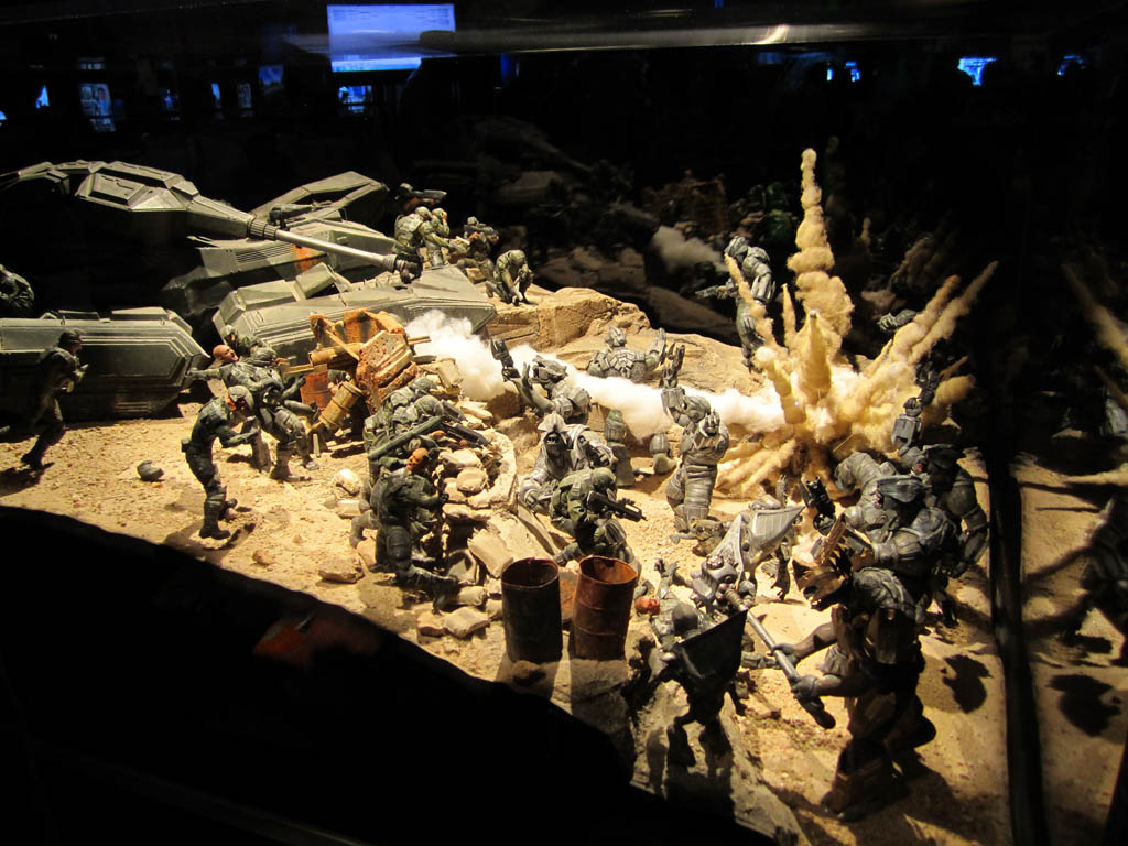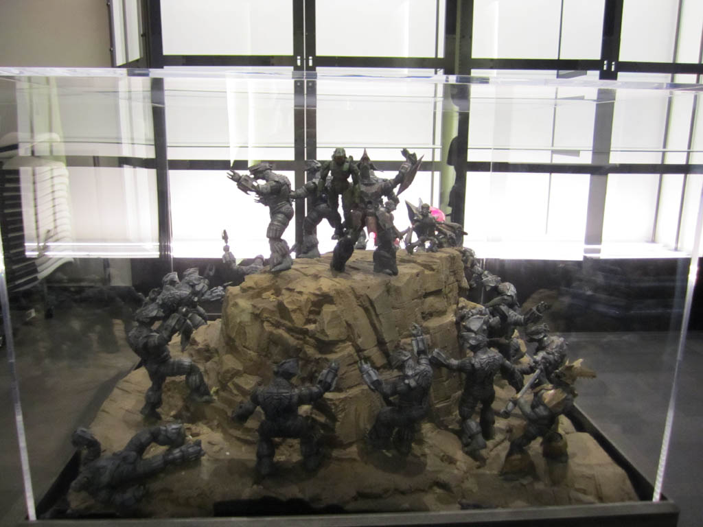 Moving on there was a large screen and a booth manned by 343 Industries folk and other volunteers giving out swag. Next stop was another chunk of the Believe diorama. Hunters, Marines and building fragments. Larger than you might have expected...the Marines were larger than McFarlane figures. Near this display was an Elite in an attack pose and a stationary UNSC turret where people could pose 'firing' at the life-sized Elite. Both were flat cutouts, but the sense of scale was impressive.