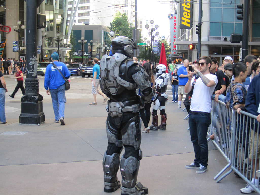 We took the motel shuttle (the one thing the inn DID provide) to the Sea-Tac Airport and boarded the Sound Transit light rail into downtown Seattle. We walked up from the Westgate terminal about two blocks to the Washington State Convention Center to see where PAX and Halo Fest would take place. We knew Halo Fest was going to be glorious as we could already see the life-size Jorge-052 statue in the window!