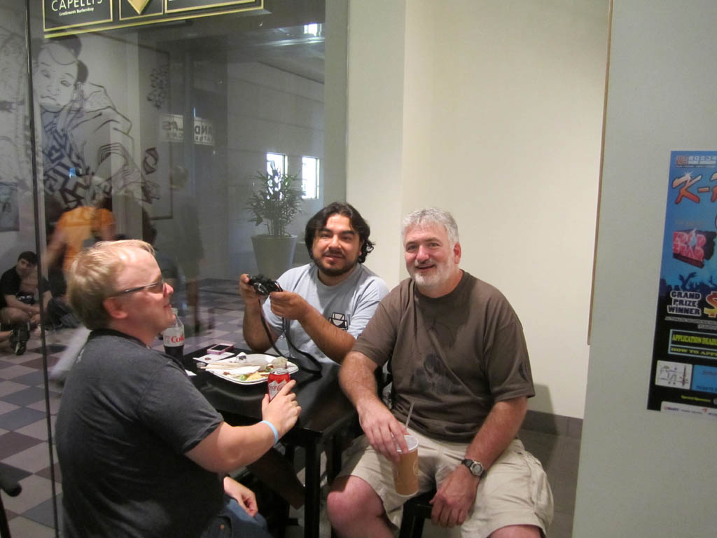 After the panel, some of us wandered out to garb some grub. We ended up in a nearby food court that didn't adequately plan for the rabid throng of gamers descending on Seattle. Jimmy John's, the sandwich place we went to ran out of bread...not funny when you're starving. Well, I found it funny, but then, I'd ordered just before they ran out. Sorry Claude. :) Gamers sat with other gamers; it didn't matter who. I shared a table with a couple of guys from Washington D.C. there for PAX. After lunch, I wandered over to see where Brad and Claude had gotten lunch, and found Bungie's #1 fan Miguel there as well. Another long-standing HBOer I was happy to meet in person. You're a funny and genuine guy, Mig! And I totally back you up that your phone is not pink, but 'Covenant purple'.