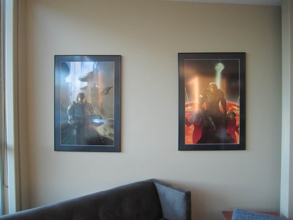 Sadly, not a lot of pics taken inside. I took a few of the front lobby area. There's a giant Anniversary poster, some framed artwork of the 'Definitive' novels, and lots of other posters and collectibles in the corridor that used to be Bungie's 'trophy wall' seen on the famous Bungie webcam. We could only venture from the lobby to the trophy corridor to the play test room (with 17 stations of Xboxes). Watched some Anniversary maps played for a while (as there were 24 of us and only 17 stations...I arrived later than most as Mr. Vociferous doesn't quite know the route between Seattle and his workplace...though we had some awesome Halo discussions while we retraced our route.) (Sorry Jeremy, I had to call you out on that one!) :)