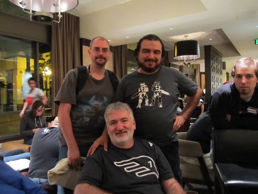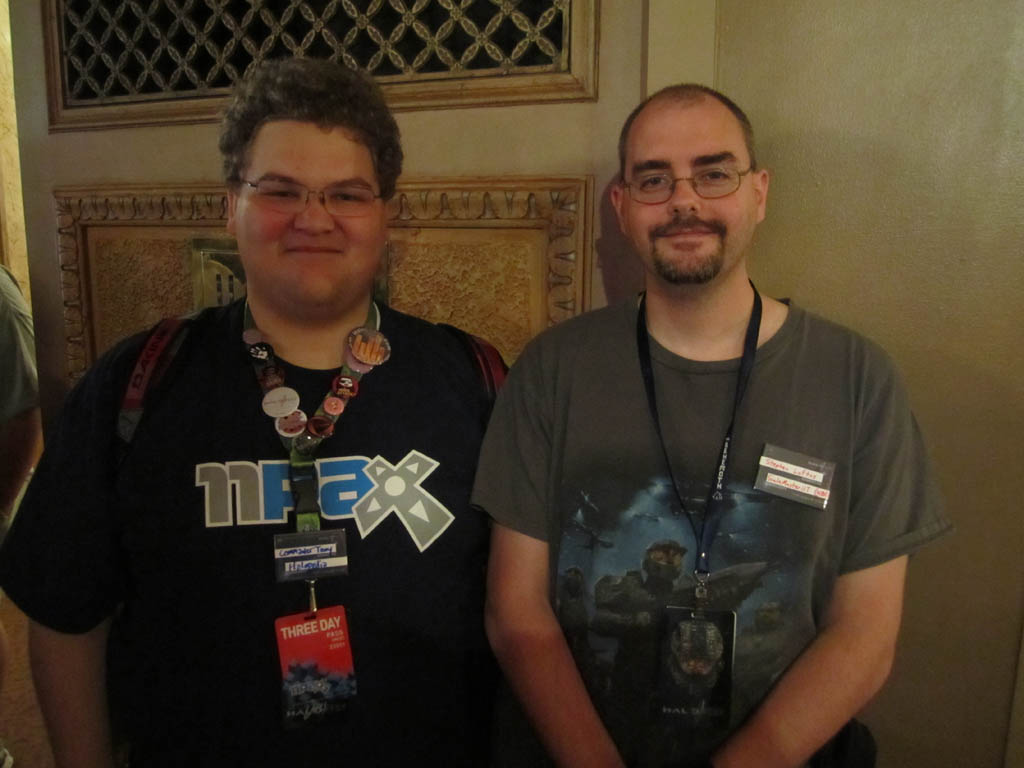 Shortly after arriving, pizza arrived. I grabbed two slices and a Coke and sat on a couch in the lobby. Pete freaking Stacker grabs some pizza and sits down next to me! Then, Tim Dadabo sits on the other side of me in a chair! The last chair across from us was occupied by Grimbrother One! Can you top that?! I tried not to talk too much Halo with them as they must've heard that constantly while at Halo Fest. Pete and I (yes, we're on a first name basis, what of it?) talked about his home sound studio and the engineering principles behind anechoic chambers. The guy's a genius when it come to the sound medium! We also talked about his daughter out east in the hurricane's path that had been moving up the eastern US that weekend. Pete also told me definitively that I WASN'T flying out Monday morning, but as it turns out, I did. He also mentioned some of the voice work he's done for games in casinos which is the industry in which I work. Pretty cool! Tim and Jeff were talking shop and Pete and I interjected some conversation as well.