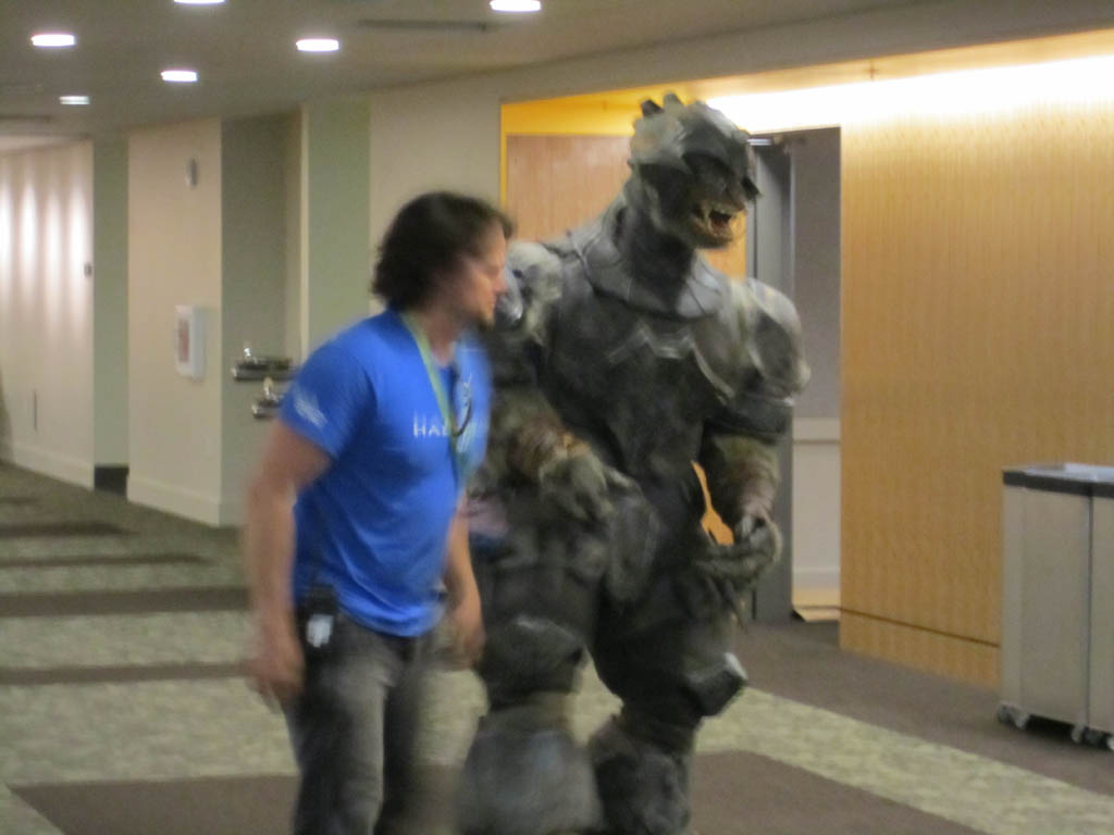 Back at Halo Fest, we met up with some of the 343 management, notably Halo 4 exec producer Kiki Wolfkill (from the previous panel), Alison Stroll, and the tip of the 343 pyramid, Bonnie Ross. This was on the second level of the Halo Fest building where the event staff and 343i folks could hang out away from us Halo fans. We saw a costumed Brute from the "We are ODST" commercial. He was in a hurry to be somewhere so the only pics I could snag are blurry. Claude and I made sure Levi got to present his Fistful of Arrows print to the head of Halo 4's art department. They had a nice discussion and I hope they're impressed enough to give my man Levi some work in the near future.