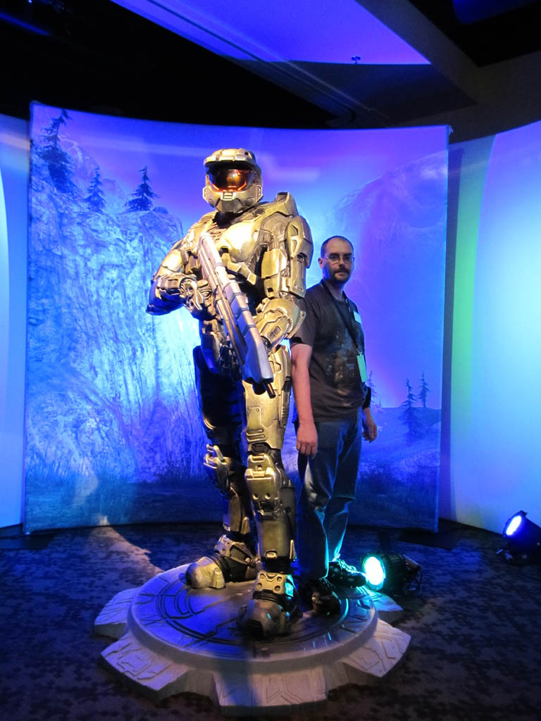Up to the Halo Fest third floor, I got to wander around with Levi and Maddie. We played some Anniversary Firefight together. We wandered to the Halo story panels at the back corner of the floor and talked about the giant UNSC ship concept art and traded cameras to get our pics taken with the full-sized Master Chief statue. I don't think I was supposed to but I stood on the disc platform the statue was mounted on so I'd have a good indicator of John's height compared to mine.