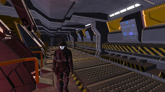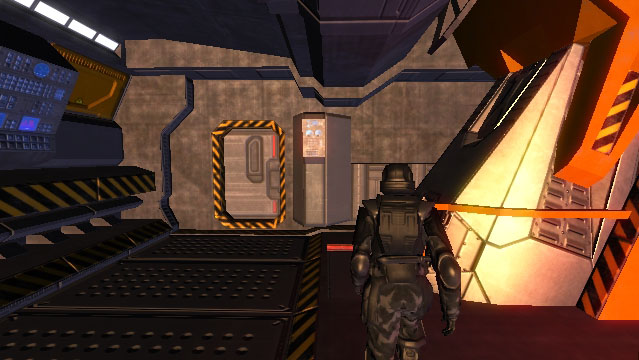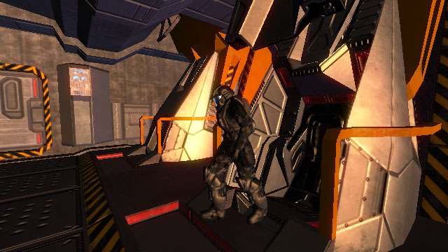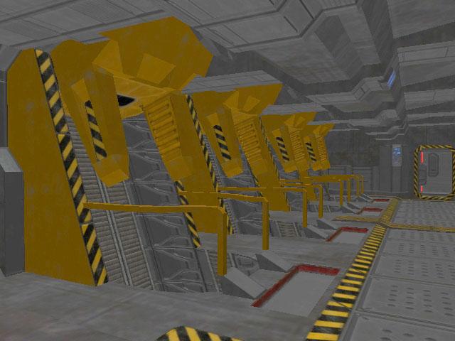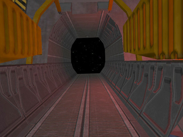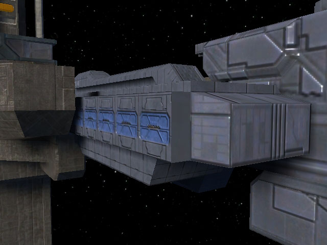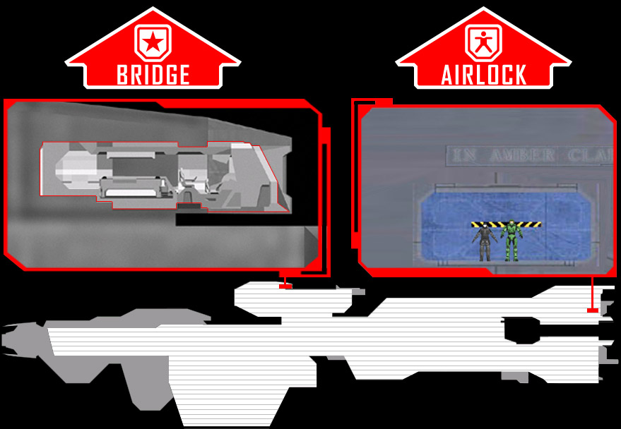 At the forward starboard portion of the upper mandible of In Amber Clad is the main boarding airlock. This is a standardized hatch that can hard dock to other UNSC ships and installations. In addition to providing pressurized atmospheric ingress/egress for crewmembers (such as when docked at a space station), the airlock contains connection umbilical trunks for electrical power, fuel transfer, and data waveguides. The hatch is divided horizontally with each half retracting into the ceiling and floor.
