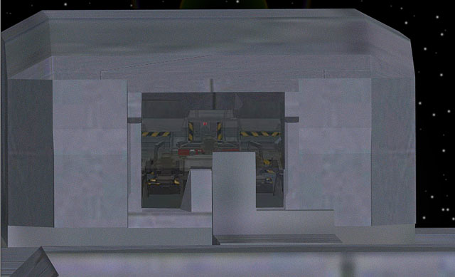 The In Amber Clad's Pelican Hangar has its hatch at the aft end of the ship's wide mid-section. Several Pelican and Albatross dropships are stored and maintained in the hangar and maintenance facilities on board. Garages for the complement of Scorpion tanks and the ship's fleet of Warthogs are stored in proximity to the dropships.