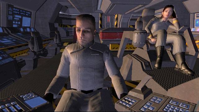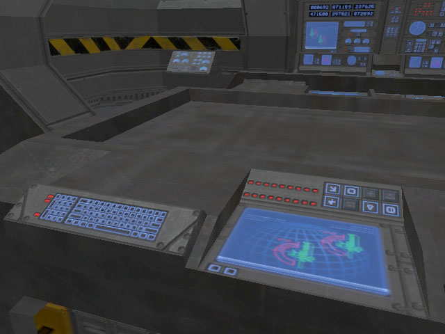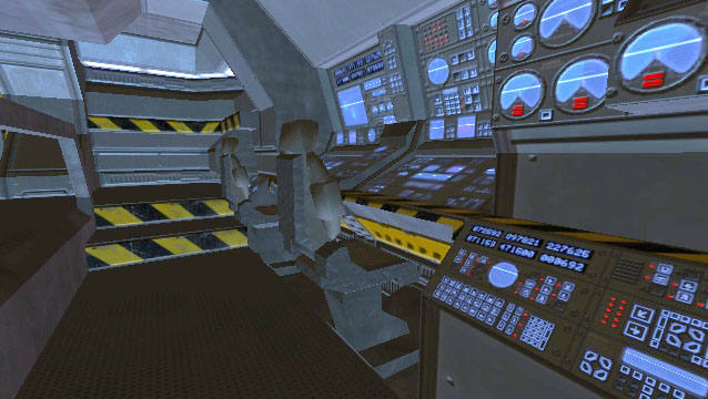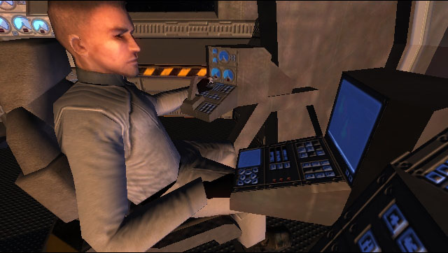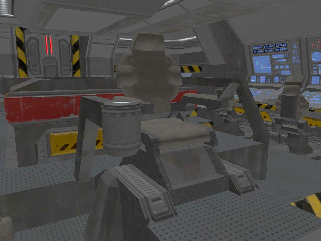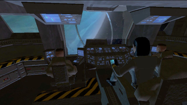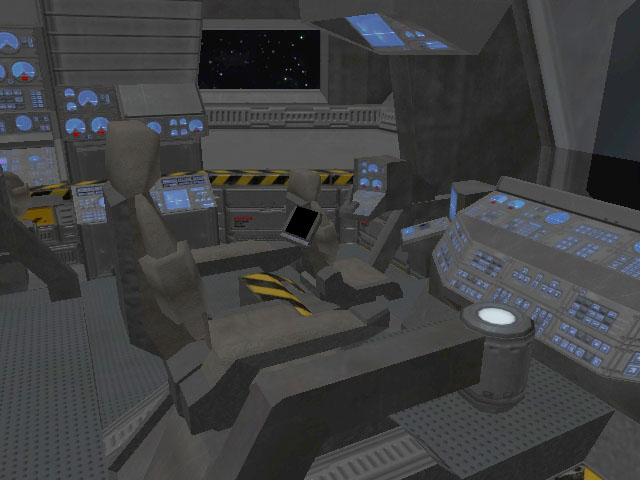 At the very top of the frigate is the bridge. It is a modest-sized room with seated positions for seven officers and crew, and a central situation table. A large window affords a view out the bow of the ship. Behind the viewport is the navigation (starboard) and tactical (port) stations. Centrally located behind the NAV and TAC consoles is the command chair. The chair is accessible from the port side and has a data console on the left arm. The bridge holotank is situated to the right of the command chair. Remaining positions around the bridge's periphery are designated for other common bridge stations such as Communications (COM), Engineering (ENG), Ship Operations (OPS) and Computer Status. The exit to the bridge is a sliding hatch located at the center aft bulkhead.