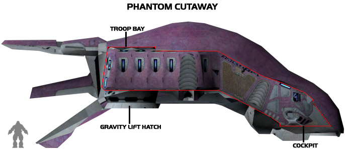 The Phantom is the second of two Covenant dropship types encountered by UNSC forces. The Phantom is the more maneuverable of the two and packs more firepower. It is generally accepted to be a later, more advanced design than the first.
